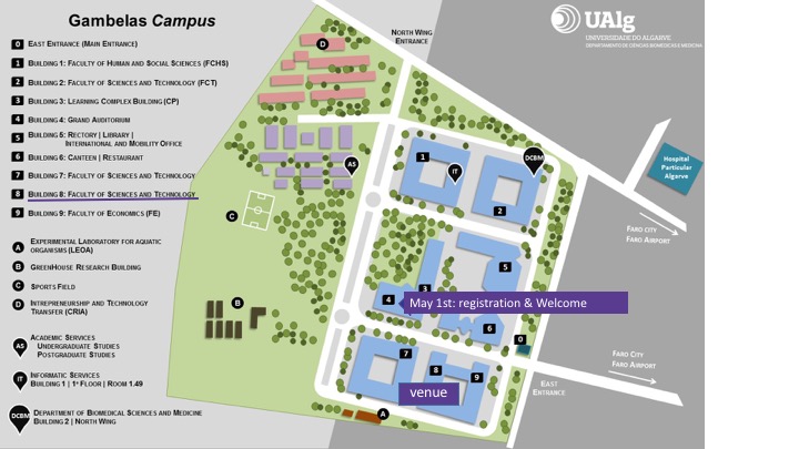 The University has four campi but the meetings will take place at campus Gambelas (GPS Coordinates: 37°02'34.9"N 7°58'15.6"W), at "Green" Amphitheater (basement, building #8).
